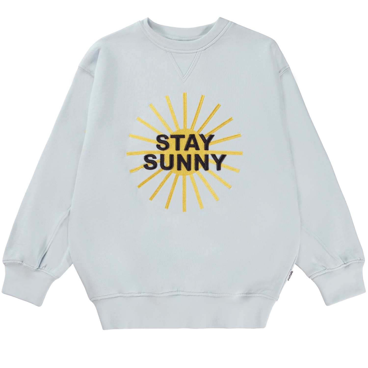 Magni ist ein hellblaues Sweatshirt mit aufgestickter Sonne und dem Text „Stay Sunny“. Das Sweatshirt hat Rippkante am Hals, am Saum und an den Ärmelenden.