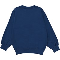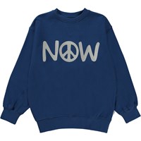 Magni ist ein dunkelblaues Sweatshirt mit großer grauer Stickerei von „NOW“ und einem Peace-Zeichen in der Mitte. Das Sweatshirt hat Rippkante am Hals, am Saum und an den Ärmelenden.