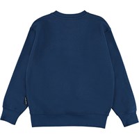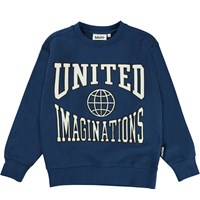 Mann ist ein dunkelblaues Sweatshirt mit dem Aufdruck "United Imaginations" auf der Vorderseite. Mann hat Ripp im Nacken, an den Handgelenken und an den Hüften. Dieses Produkt ist Öko-Tex zertifiziert.
