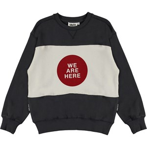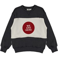 Mann ist ein dunkelgraues Sweatshirt mit einem breiten hellen Streifen in der Mitte und einem roten Kreis mit der Aufschrift "We are here".