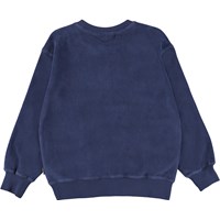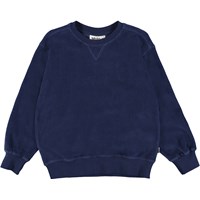 Mann ist ein blaues Frottee-Sweatshirt. Kombinieren Sie das Sweatshirt mit einer passenden Hose.