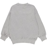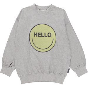 Mar ist ein graumeliertes Sweatshirt mit einem aufgestickten Smiley auf der Vorderseite mit dem Text „hello“. Das Sweatshirt ist an Hals, Ärmeln und Hüften gerippt. Dieses
