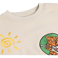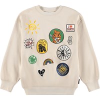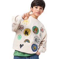 Beiges Sweatshirt aus weicher, ökologischer Baumwolle mit Rundhalsausschnitt und gerippten Kanten an den Ärmeln, am Hals und am Saum. Das Sweatshirt hat eine lockere, entspannte Passform mit bunten Aufnäherstickereien.