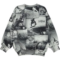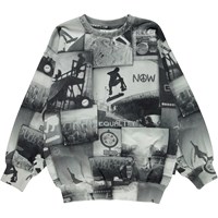 Mar ist ein graues Sweatshirt mit einem Aufdruck einer Collage aus verschiedenen Bildern, auf denen Skater auf Rampen auf der ganzen Welt zu sehen sind. Das Sweatshirt hat Rippkante am Hals, am Saum und an den Ärmelenden.