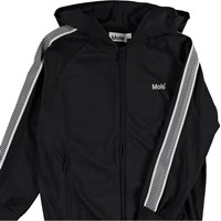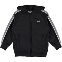 Marco ist eine schwarze Track-Jacke mit weißen Netzstreifen an den Ärmeln. Die Jacke hat eine Kapuze und einen Reißverschluss.