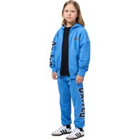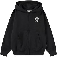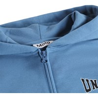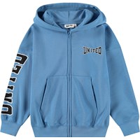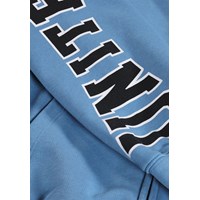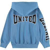 Blauer Hoodie aus weicher Baumwolle mit Kängurutasche, Frontreißverschluss und gerippten Kanten an den Ärmeln und am Saum. Der Hoodie hat eine lockere, entspannte Passform mit einem Druck auf der Vorderseite, dem Ärmel und dem Rücken mit dem Text 'Únity'.