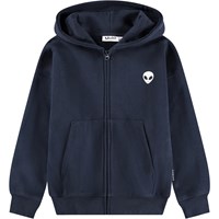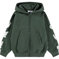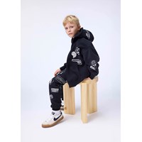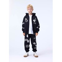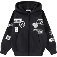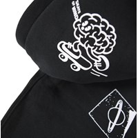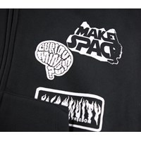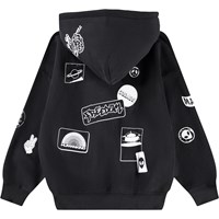 Schwarzer Baumwoll-Hoodie mit einer Kängurutasche, einem vorderen Reißverschluss und gerippten Bündchen und Saum. Dieser Hoodie hat einen weißen Aufdruck mit verschiedenen grafischen Symbolen und Texten.