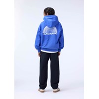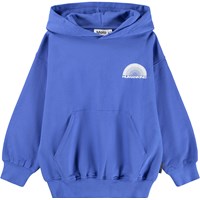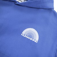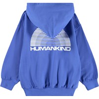 Blaue Kapuzenjacke aus Öko-Baumwolle mit einer Kängurutasche und gerippten Bündchen und Saum. Diese Kapuzenjacke hat einen weißen Aufdruck einer Sonne und den Text ''Humankind''.