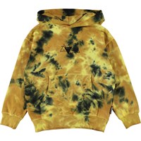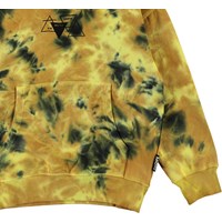 Matt ist ein gelb-schwarzer Tie-Dye-Hoodie mit einer Känguru-Tasche auf der Vorderseite.