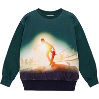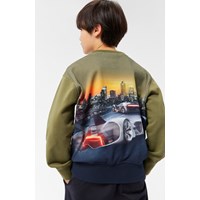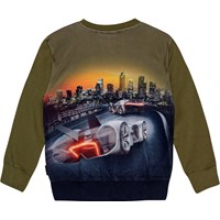 Armee-grünes Sweatshirt aus Öko-Baumwolle mit Rundhalsausschnitt, gerippten Bündchen und Saum. Das Sweatshirt hat eine normale Passform und einen Druck auf Vorder- und Rückseite. Der Druck zeigt schnelle Rennwagen im Wettbewerb mit einer Stadtsilhouette im Hintergrund. Die Bluse hat ein gebürstetes Innenfutter, das sie weich und warm macht.