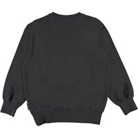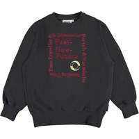 Mattis ist ein dunkelgraues Sweatshirt mit burgunderroten gesticktem Text auf der Vorderseite, der sich mit Zeitreisen befasst.