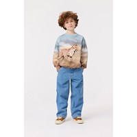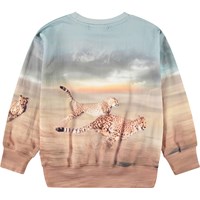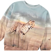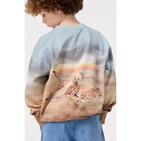Blaues und braunes Sweatshirt aus weicher Öko-Baumwolle mit gerippten Kanten am Hals, an den Ärmeln und am unteren Saum des Sweatshirts. DasSweatshirt hat eine normale Passform und einen Aufdruck von Geparden, die in voller Geschwindigkeit rennen.