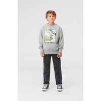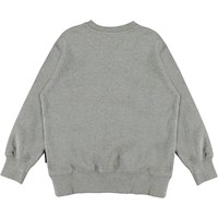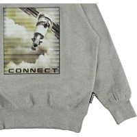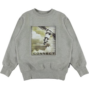 Mattis ist ein graues Sweatshirt mit dem Aufdruck eines Satelliten auf der Vorderseite.