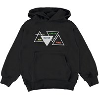 Matt ist ein schwarzer Hoodie mit Stickerei der vier Elemente auf der Brust.