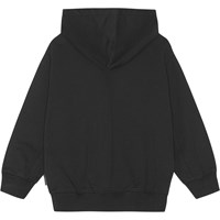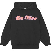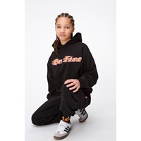 Schwarzer Hoodie mit orange-lila platziertem Frontprint, aus 100% Öko-Baumwolle. Der Aufdruck besteht aus dem Text „On Fire“, der in flammenden Buchstaben auf die Brust geschrieben ist. Der Text ist in Orange mit einer erhabenen violetten Umrandung gedruckt. Maxx hat eine Kapuze, lange Ärmel, eine Kängurutasche, Rippbündchen an Ärmeln und Hüfte und eine übergroße Passform. Kombinieren Sie diesen Hoodie mit der Hose Adan in derselben Farbe und demselben Aufdruck für das perfekte Set.