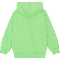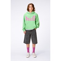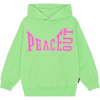 Grüner Hoodie mit platziertem Frontprint. Der Druck ist lila mit einer gelben Umrandung und sendet die Botschaft „Peace Out“. Der Pullover hat eine übergroße Passform, eine Kapuze, eine Kängurutasche und gerippte Bündchen und Hüften.