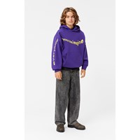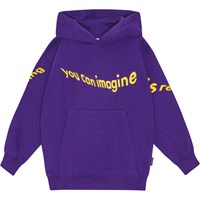 Lila Hoodie aus Öko-Baumwolle mit Kapuze, Kängurutasche, gerippten Abschlüssen und einer gebürsteten Innenseite, die ihn weich und warm zu tragen macht. Der Hoodie hat eine übergroße Passform und bedruckten Text auf der Vorderseite und den Armen, der "Everything you can Imagine is Real" lautet. Der Text ist verzerrt und fast wellenförmig.