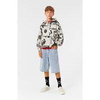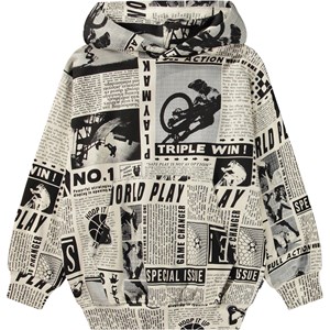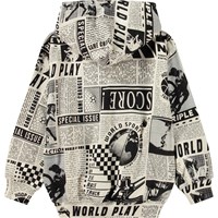 Schwarz-weißer Hoodie aus Öko-Baumwolle mit Kapuze, Kängurutasche, gerippten Kanten und einer gebürsteten Innenseite, die ihn weich und warm zu tragen macht. Der Hoodie hat eine übergroße Passform und ein Allover-Print. Der Print ist ein schwarz-weißer Zeitungscollage-Print mit Bildern und Artikeln über verschiedene Sportarten.
