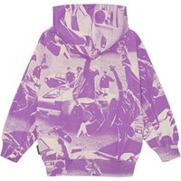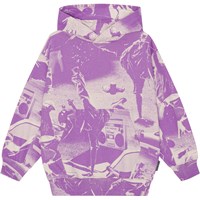 Öko-Hoodie mit Allover-Breakdancer-Print in Lila. Der Druck ist ein zweifarbiger abstrakter Druck, der Breakdancer und Autos auf der Straße darstellt. Das Hemd hat eine übergroße Passform, eine Kapuze, eine Kängurutasche und gerippte Bündchen und Saum.