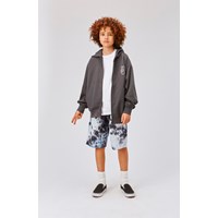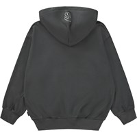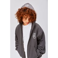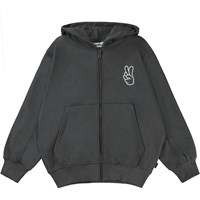 Mazz ist ein dunkelgrauer Hoodie mit einem Aufdruck von Handzeichen auf der Vorderseite und der Kapuze. Der Hoodie hat eine Kängurutasche und einen Reißverschluss auf der Vorderseite sowie Rippkante an Ärmeln und Hüfte. Dieses