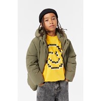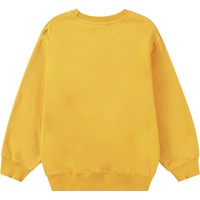 Gelbes Sweatshirt aus Öko-Baumwolle mit gebürstetem Innenfutter, das weich und warm zu tragen ist. Das Sweatshirt hat eine normale Passform, einen Rundhalsausschnitt, gerippte Abschlüsse und ein aufgedrucktes Design auf der Vorderseite mit einem großen lächelnden Pixelgesicht, das zwinkert.