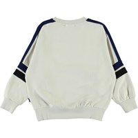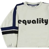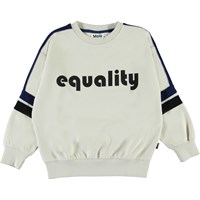 Mexon ist ein rauweißes Sweatshirt mit schwarz und blau genähten Streifen an den Ärmeln. Auf der Vorderseite der Bluse ist der Text 'Equality' aufgedruckt.