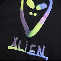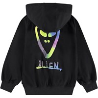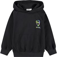 Schwarzer Hoodie aus Öko-Baumwolle mit einer Kängurutasche und gerippten Bündchen und Saum. Dieser Hoodie hat einen bunten Alien-Print.