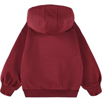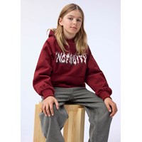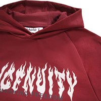 Dunkelroter Hoodie aus Öko-Baumwolle mit einer Kängurutasche und gerippten Bündchen und Saum. Dieser Hoodie hat einen Aufdruck des Textes ''Ingenuity'', umgeben von Flammen.