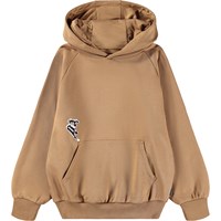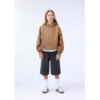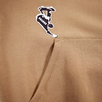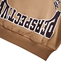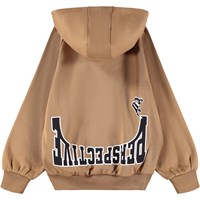 Brauner Hoodie aus Öko-Baumwolle mit einer Kängurutasche und gerippten Bündchen und Saum. Dieser Hoodie hat einen schwarz-weißen Druck von Skatern und dem Text ''Perspective''.