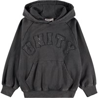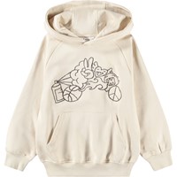 Beiger Hoodie aus weicher, ökologischer Baumwolle mit gerippten Kanten an den Ärmeln und am Saum. Der Hoodie hat eine übergroße und lockere Passform mit einer Kängurutasche vorne und einer verspielten und lustigen Stickerei.
