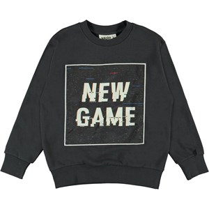 Mik ist ein schwarzes Sweatshirt mit aufgenähtem Druck auf der Vorderseite mit dem Text 'New game'.