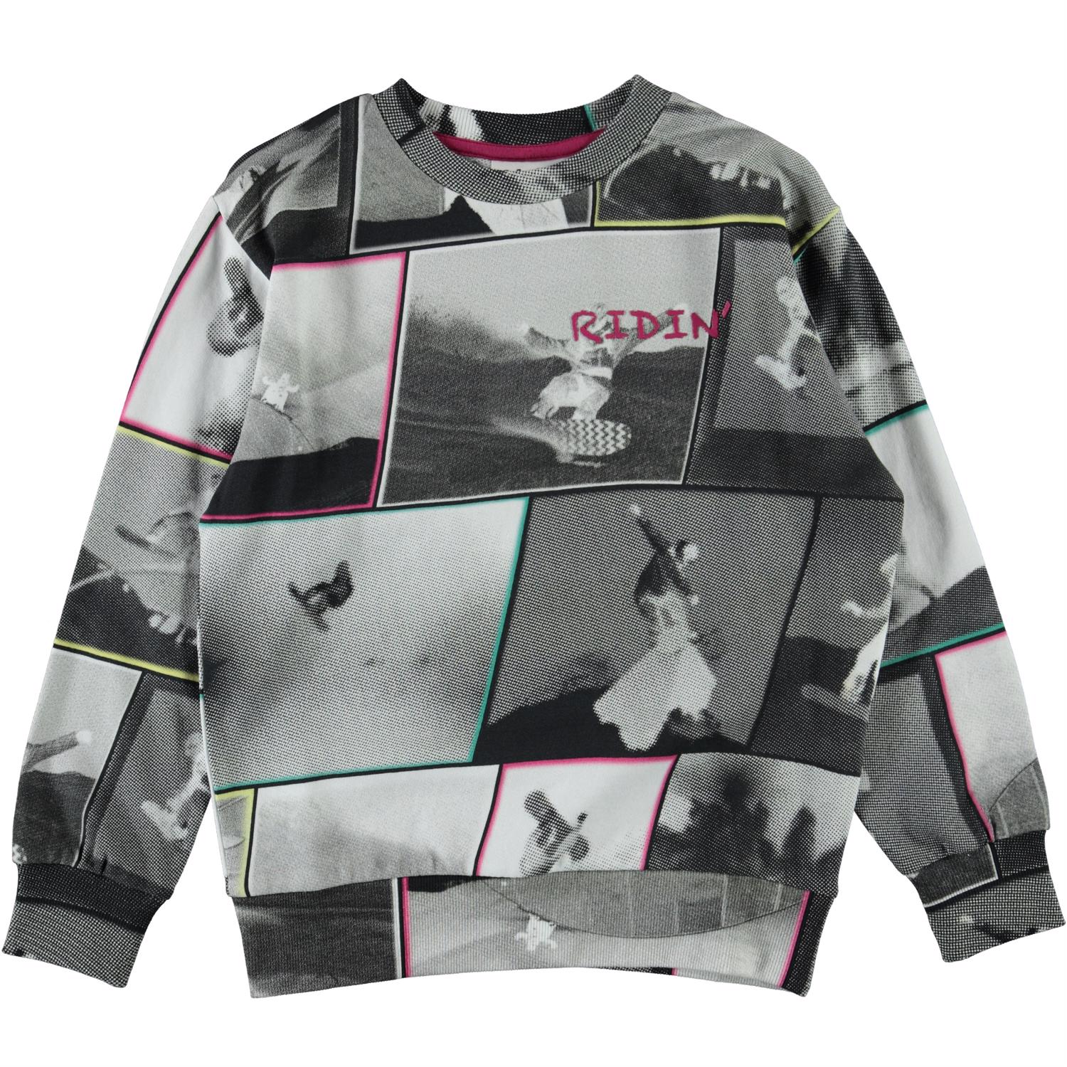 Mik ist ein graues Sweatshirt mit farbigen Quadraten und Drucken von Snowboardern.