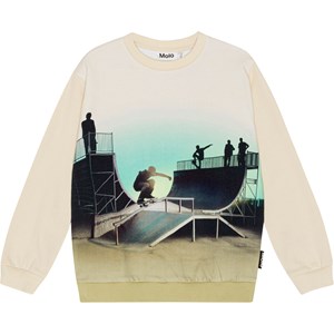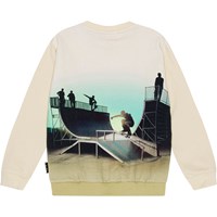 Beiges Öko-Sweatshirt mit platziertem Skate-Print in Türkis und Schwarz. Der Druck zeigt eine kleine Gruppe von Skatern in vollem Gange bei einer Session auf einer vertikalen Rampe. Der Druck setzt sich auf der Rückseite fort. Das Shirt hat eine normale Passform, einen Rundhalsausschnitt mit Rippbündchen und Rippbündchen an Handgelenken und Hüften.