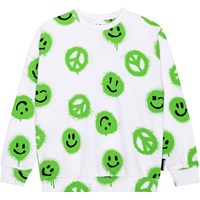 Weißes Sweatshirt mit grünem und schwarzem Allover-Print, hergestellt aus 100% Öko-Baumwolle. Der Druck zeigt viele aufgesprühte Friedenszeichen und lächelnde Gesichter, die zusammen die Botschaft von „More Love“ verbreiten. Dieses Sweatshirt hat einen Rundhalsausschnitt, Rippbündchen an Hals, Ärmeln und Hüfte und eine normale Passform.