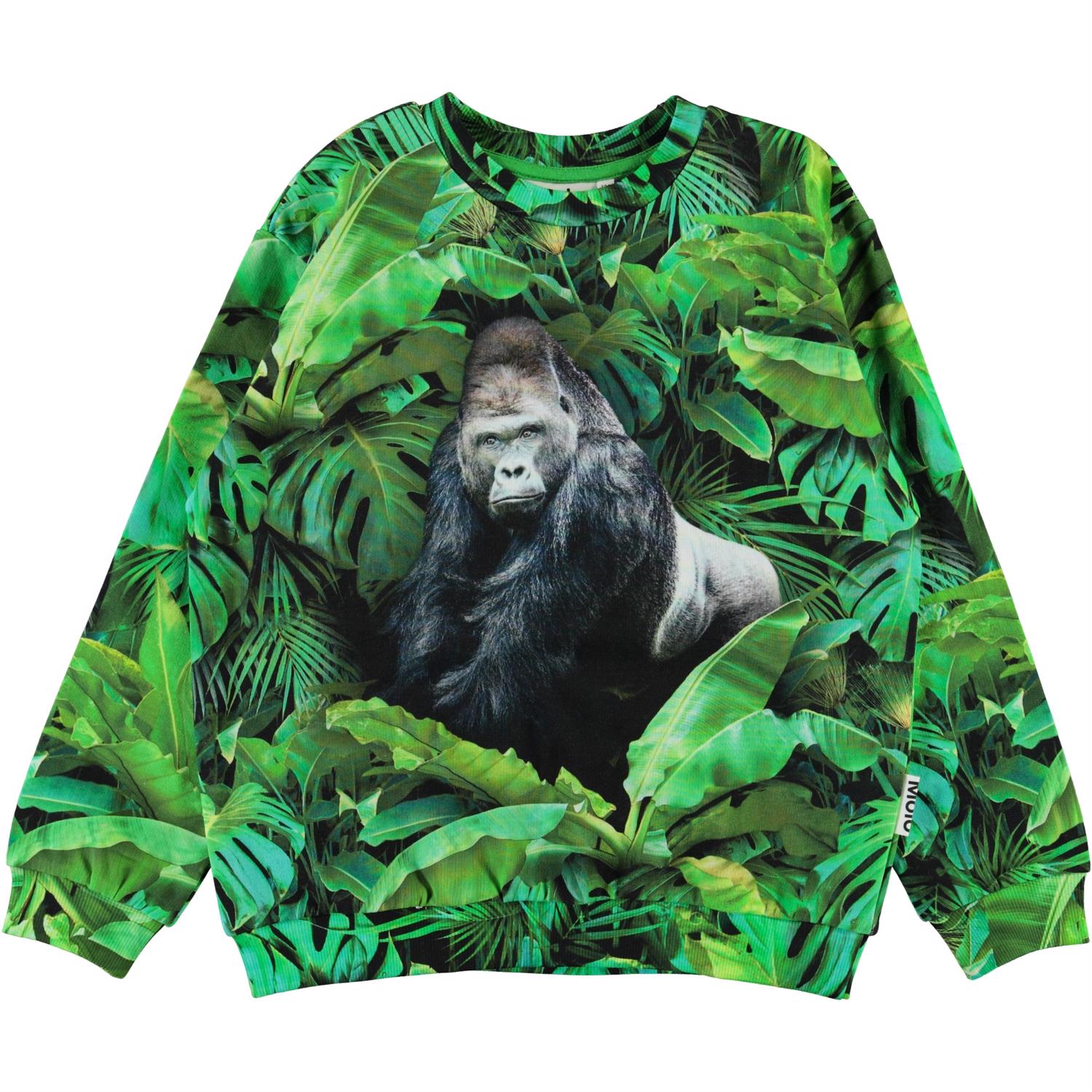 Miksi ist ein Sweatshirt in grün mit Dschungel- und Gorilla-Druck. Das Shirt hat einen Rundhalsausschnitt sowie eine elastische gerippte Unterkante und Ärmelende. Ecocert Greenlife, certifikationsnr. 197496.