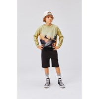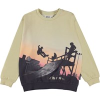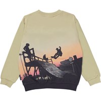 Miksi ist ein beiges Sweatshirt mit einem Aufdruck eines Skaters auf einer Rampe mit einem Sonnenuntergang im Hintergrund. Das Sweatshirt ist am Hals, am Saum und an den Ärmelenden gerippt.