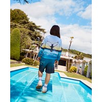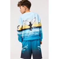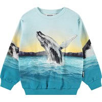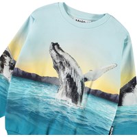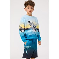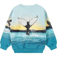 Hellblaues Sweatshirt aus weicher Öko-Baumwolle mit gerippten Kanten am Hals, an den Ärmeln und am unteren Saum des Sweatshirts. Das Sweatshirt hat eine lockere Passform mit einem Druck, der sich komplett um das Sweatshirt herum erstreckt und blaue Wale, das Meer und das schöne Leuchten der Sonne zeigt.