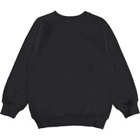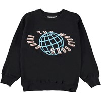 Mir ist ein schwarzes Sweatshirt mit Globus-Print und dem Text „the world goes round“.