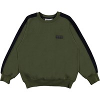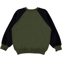 Mir ist ein grünes Sweatshirt mit blauen Ärmeln. Kombiniere das Sweatshirt mit der passenden Jogginghose.