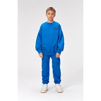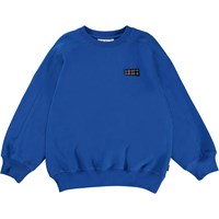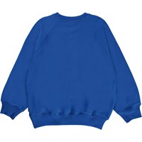 Mir ist ein blaues Sweatshirt mit einem schwarzen Stickpatch auf der linken Seite. Mir hat einen Raglan-Schnitt und hat Ripp am Hals, Handgelenken und Hüften.