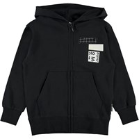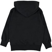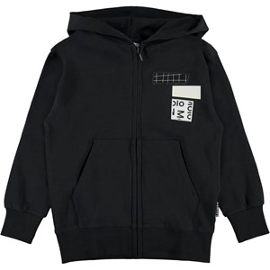 Mok ist ein schwarzes Sweatshirt mit Reißverschluss, Kapuze und verschiedenen Molo Patches auf der Brust.  Ecocert Greenlife, certifikationsnr. 197496.