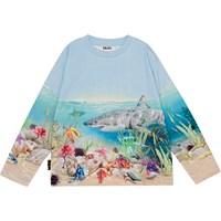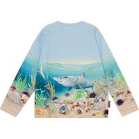 Blaues Öko-Sweatshirt mit Platzierungsdruck. Auf dem Druck sieht man einen Weißen Hai im klaren, flachen Wasser schwimmen, direkt über dem Meeresboden, der voller Leben ist. Der Pullover hat eine normale Passform und einen Rundhalsausschnitt mit Rippstrickbündchen.