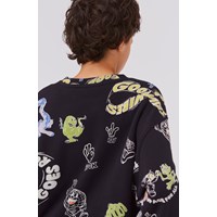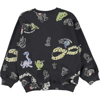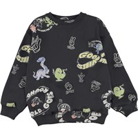 Monti ist ein schwarzes Sweatshirt mit unterschiedlichem Aufdruck von Text und Handzeichen.