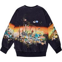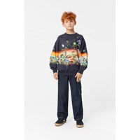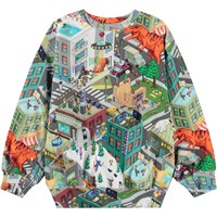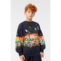 Vielfarbenes Sweatshirt aus Öko-Baumwolle mit aufgerauter Innenseite, der ihn weich und warm zu tragen macht. Das Oberteil hat eine lockere Passform, einen Rundhalsausschnitt und gerippte Kanten. Der Druck auf der Vorder- und Rückseite des Sweatshirts besteht aus bunten wilden Tieren, Rennwagen, Dinosauriern, UFOs und allerlei phantasievollen Kreaturen.