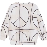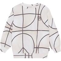 Öko-Sweatshirt mit cremefarbenem und schwarzem Rugged-Print. Der Druck ist ein beige-schwarzer Allover-Druck, der aus der Struktur und den Linien eines Basketballs besteht – einige der Linien wurden geändert, um ein Friedenszeichen zu bilden. Der Pullover hat eine lockere Passform, einen Rundhalsausschnitt mit Rippbündchen und Rippbündchen an Handgelenken und Hüften.