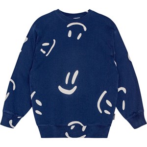 Dunkelblaues Sweatshirt aus Öko-Baumwolle mit aufgerauter Innenseite, das weich und warm zu tragen ist. Das Sweatshirt hat eine lockere Passform, einen Rundhalsausschnitt, gerippte Kanten und einen weißen Allover-Druck, der aus vielen großen lächelnden Gesichtern besteht, die sich drehen und wenden und so eine festliche Atmosphäre schaffen.