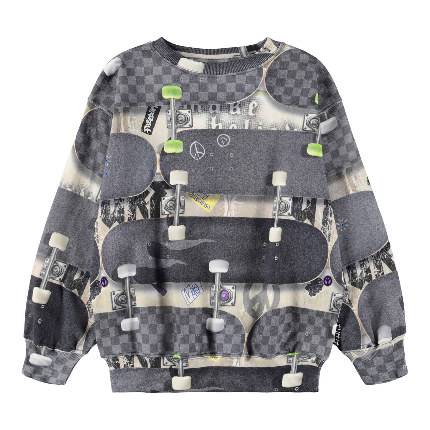 Grauer Sweatshirt aus weicher Öko-Baumwolle mit einem Aufdruck von Skateboards. Der Pullover hat gerippte Kanten am Hals, an den Ärmeln und am Saum. Der Pullover hat eine lockere Passform.