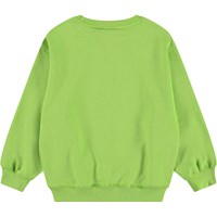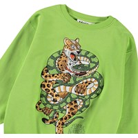 Grünes Sweatshirt aus weicher Öko-Baumwolle mit gerippten Kanten am Hals, an den Ärmeln und am unteren Saum des Sweatshirts. Das Sweatshirt hat eine lockere Passform mit einem farbenfrohen Druck eines Geparden, der von einer Schlange umwickelt ist, und dem Text 'Forza Della Natura' auf der Brust.