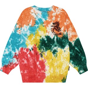 Mehrfarbiges Batik-Sweatshirt aus Öko-Baumwolle mit langen Ärmeln, Rundhalsausschnitt und geripptem Kragen. Das Sweatshirt hat eine lockere Passform und eine gebürstete Innenseite, was es weich und warm zu tragen macht. Auf der Vorder- und Rückseite befindet sich ein aufgesetzter Schablonendruck mit einem schwarzen Alligator auf einem Skateboard, auch bekannt als "Skater Gater".
