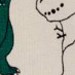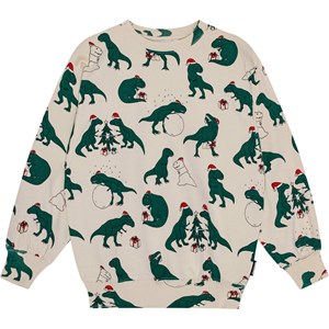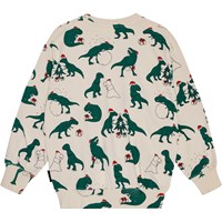 Beiges und grünes Sweatshirt aus Öko-Baumwolle mit einer gebürsteten Innenseite, die es weich und warm zu tragen macht. Das Sweatshirt hat eine lockere Passform, lange Ärmel, einen Rundhalsausschnitt mit geripptem Saum und ein Allover-Muster von Dinosauriern in festlicher Stimmung.